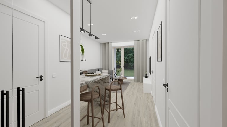 Butas projektuotas nuomai. Atsižvelgiant į šį kriterijų projektuotas žemiškų spalvų interjeras, kuris gali būti lengvai pagyvinamas ryškių akcentų ir interjero detalių pagalba, priklausomai nuo būsimų gyventojų šiuose namuose.