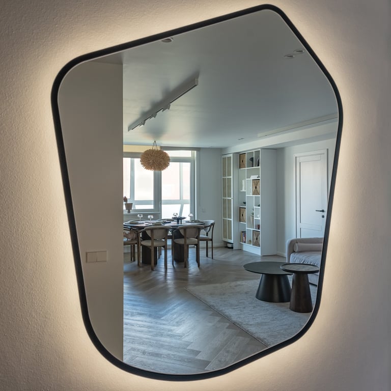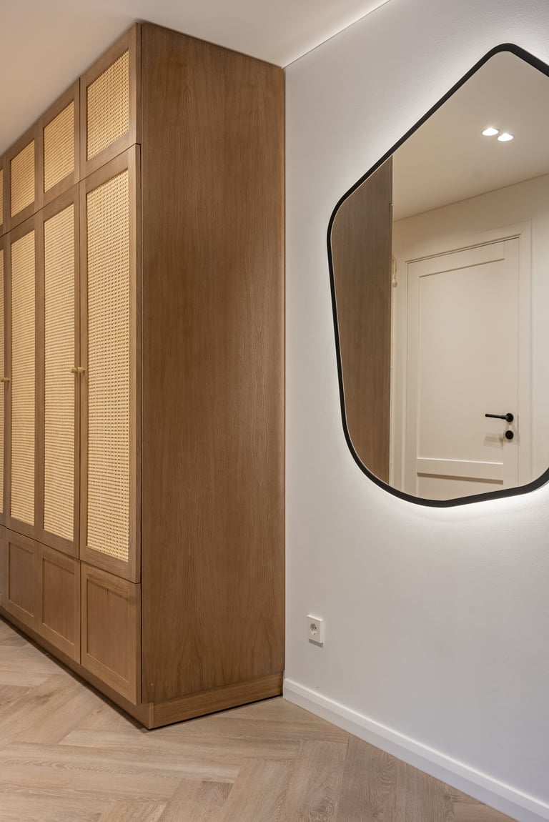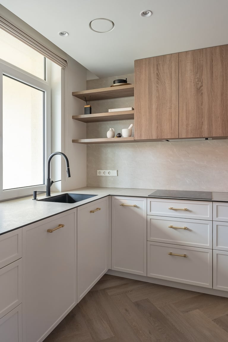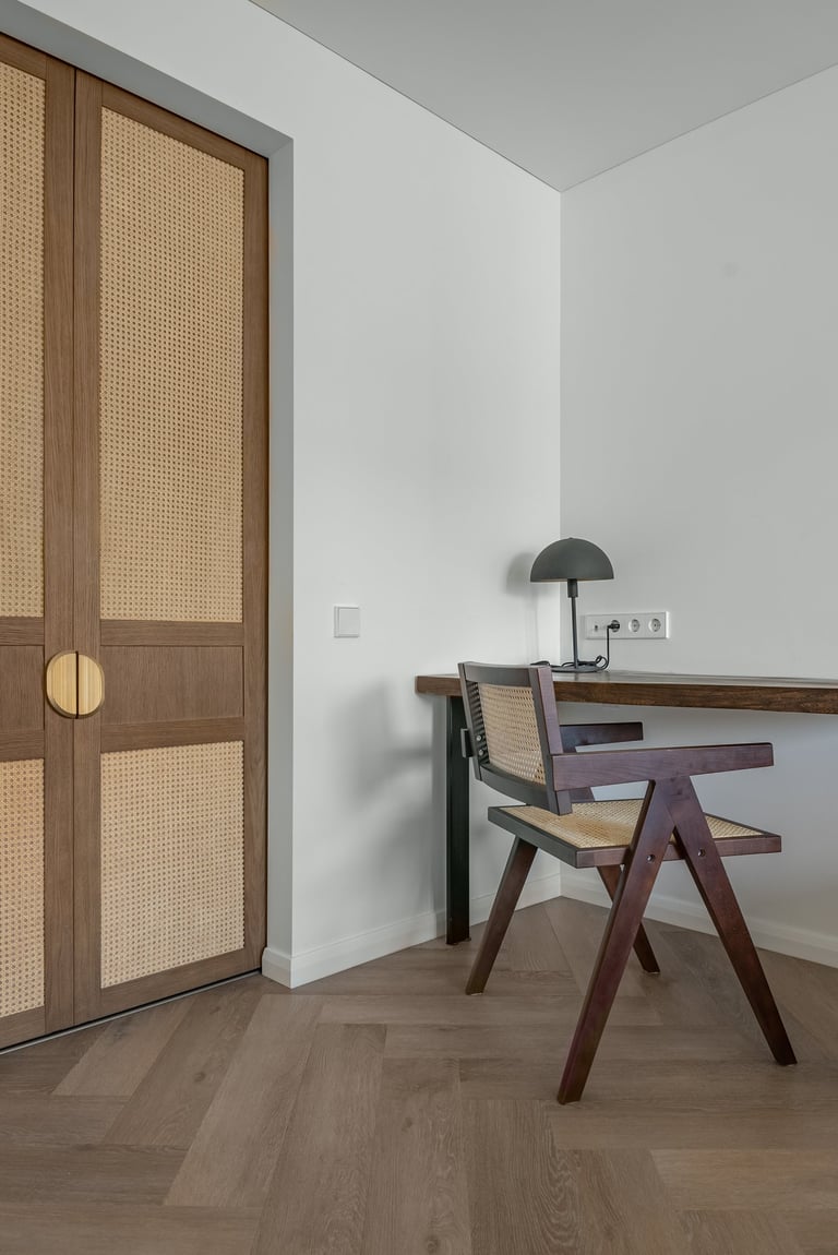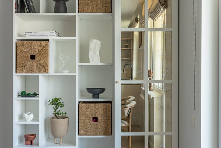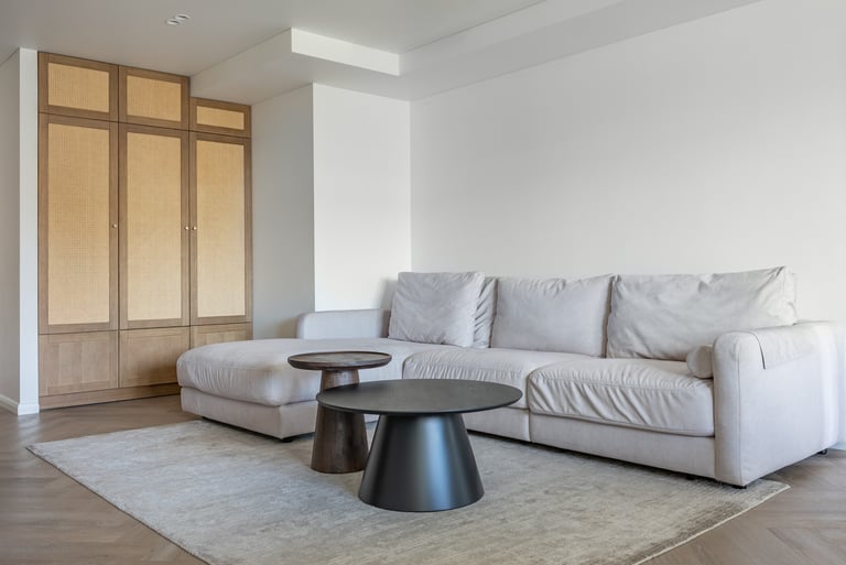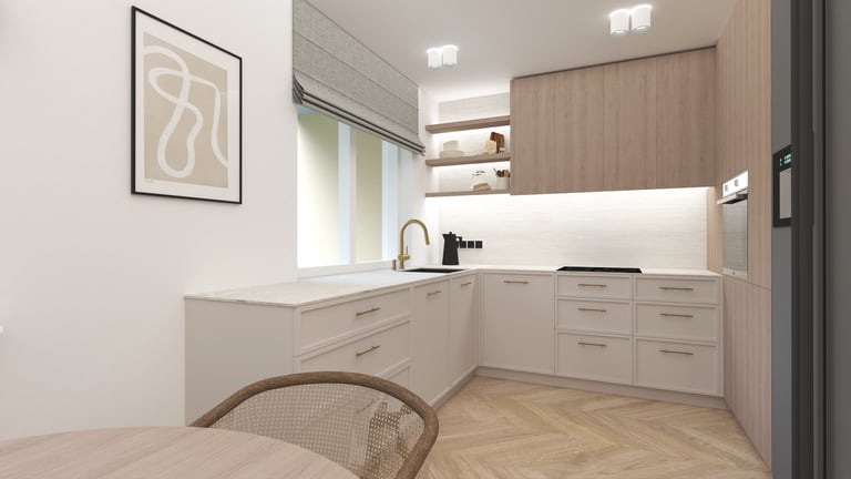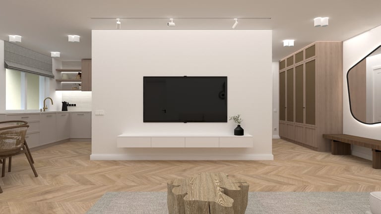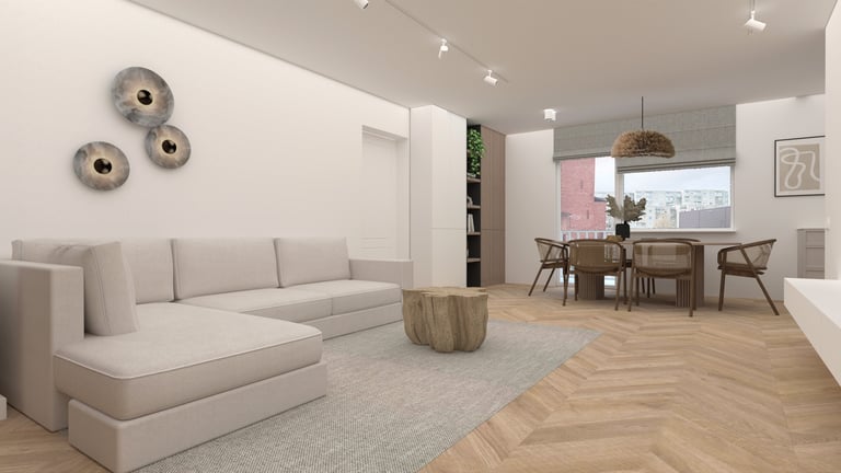 Bute pasirinkta šviesi spalvų paletė su žemiškais rudais akcentais. Atsižvelgus į klientų poreikius - butas stilistiškai "švarus", o ir praktiškas: lengvai valomi paviršiai, šeimos katinams pritaikyti audiniai, šviesi, purvą atstumenčio audinio sofa su užvalkalų skalbimo galimybe.