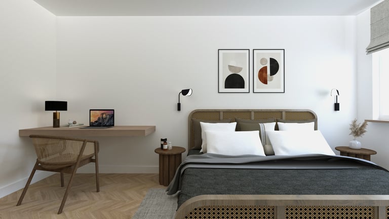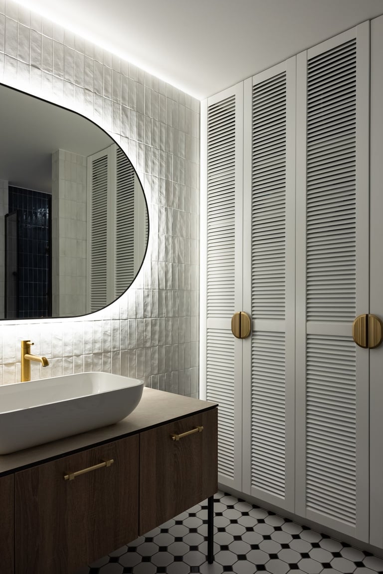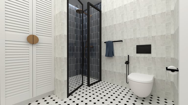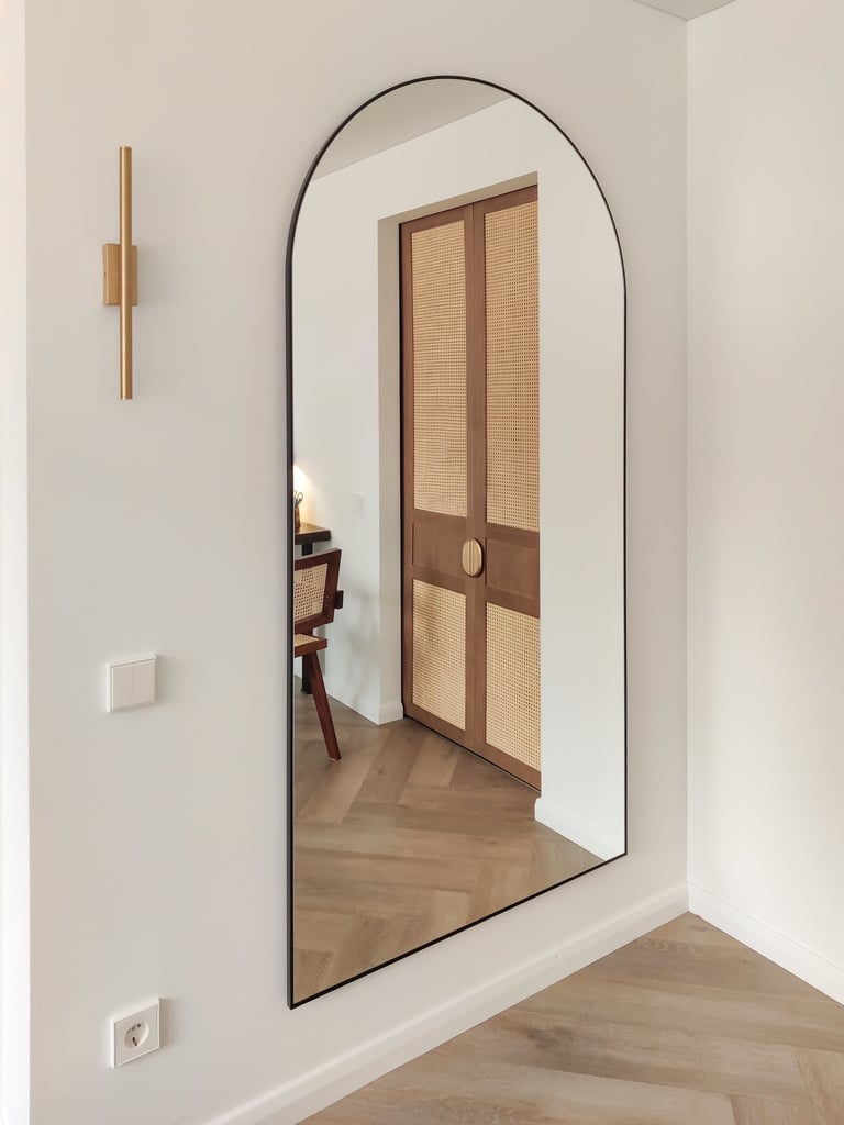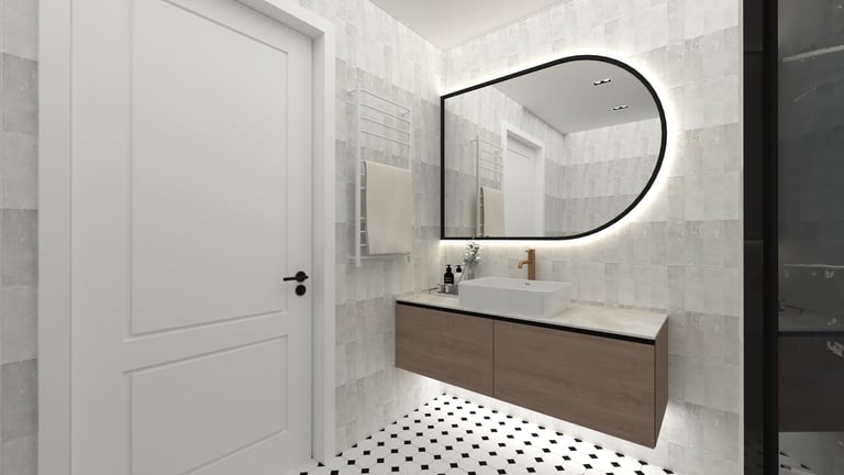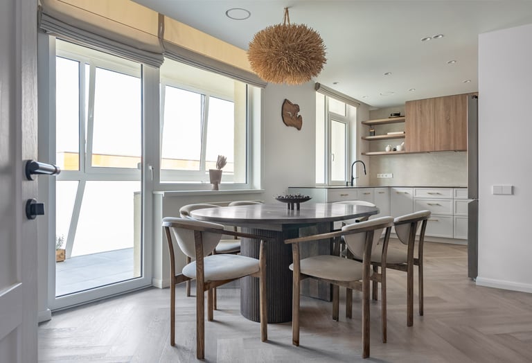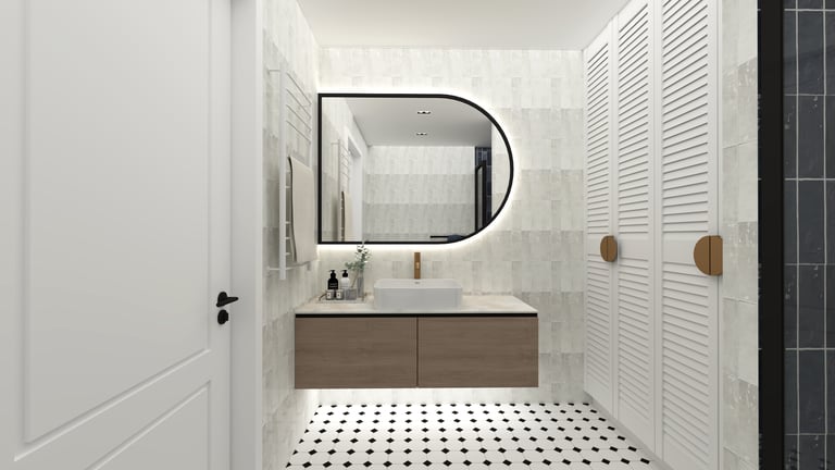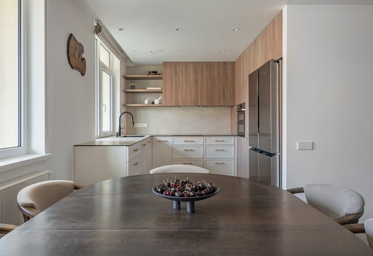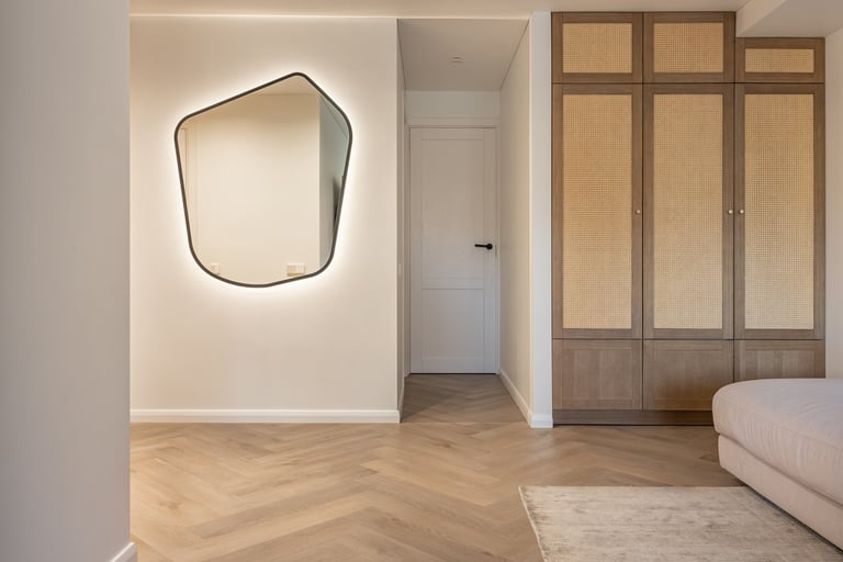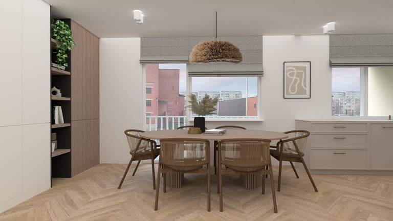 Bute pasirinkta šviesi spalvų paletė su žemiškais rudais akcentais. Atsižvelgus į klientų poreikius - butas stilistiškai "švarus", o ir praktiškas: lengvai valomi paviršiai, šeimos katinams pritaikyti audiniai, šviesi, purvą atstumenčio audinio sofa su užvalkalų skalbimo galimybe.