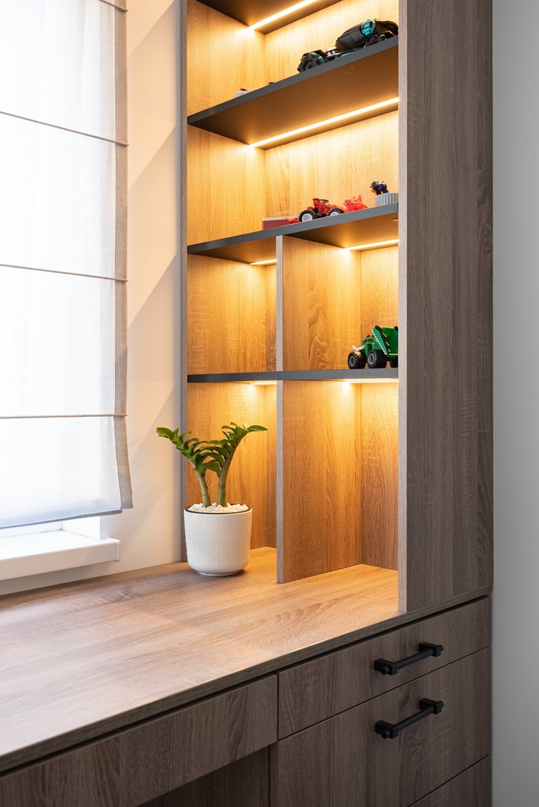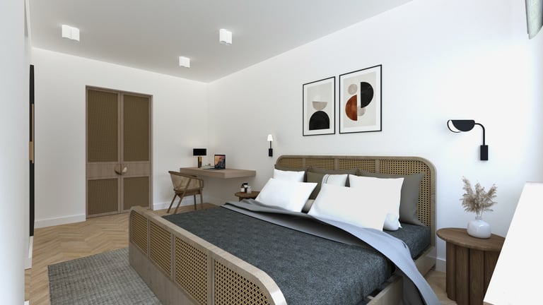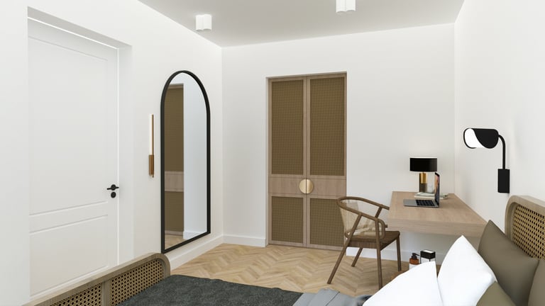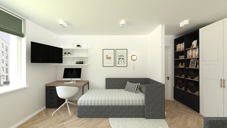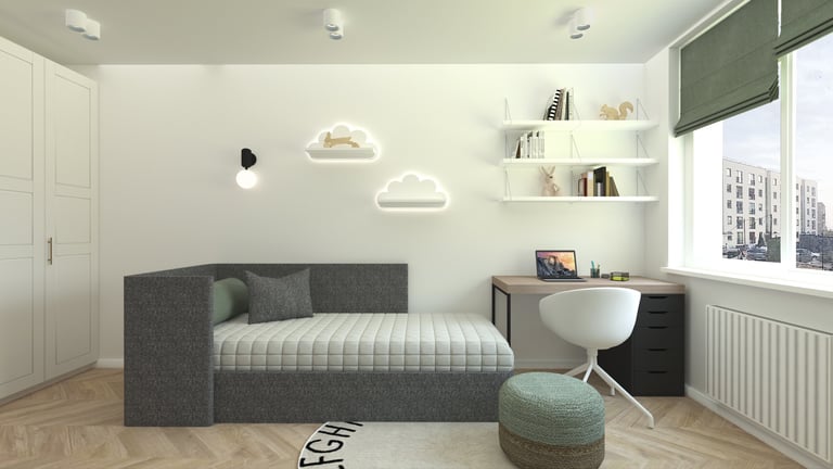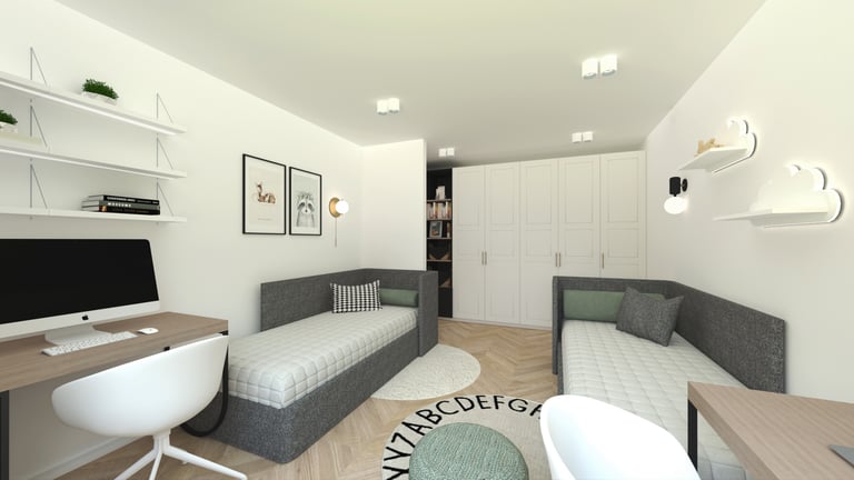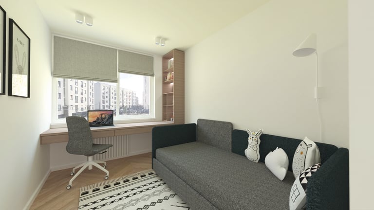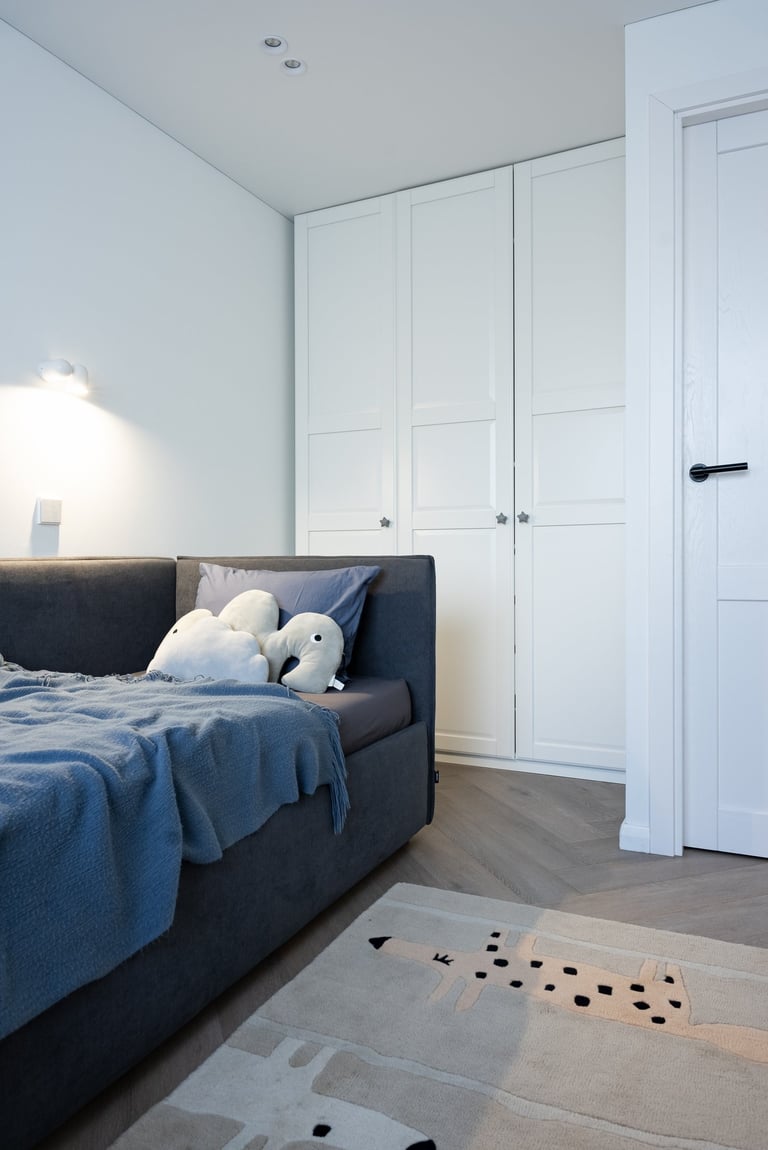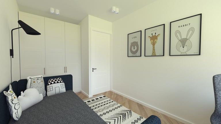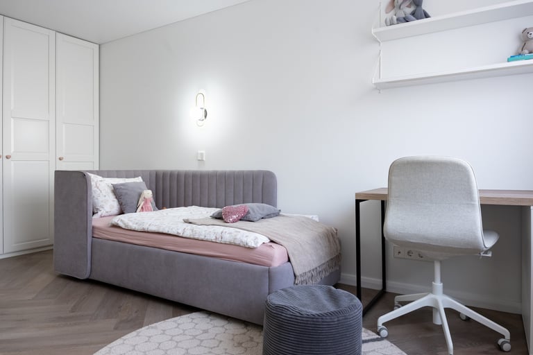 Šviesus ir jaukus butas Vilniuje, projektuotas patogiam penkių asmenų šeimos gyvenimui. Minimaliai perplanavus buto erdves suprojektuoti du atskiri vaikų kambariai. Vienas jų erdvesnis - dviejų mergaičių poreikiams, kitas, atskiras kambarys jų broliui. Bute taip pat suprojektuotas miegamojo kambarys kartu su įeinama drabužine, erdvia svetaine su valgomuoju ir virtuvės zona, atskiru ir erdviu vonios kambariu.