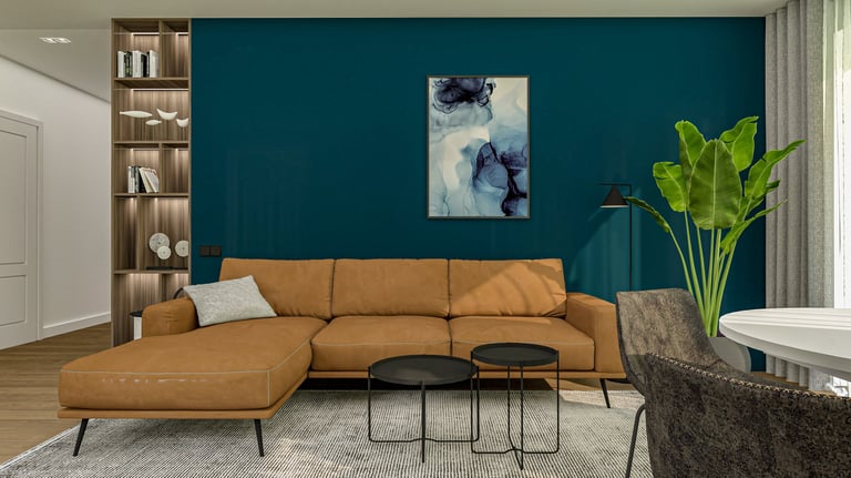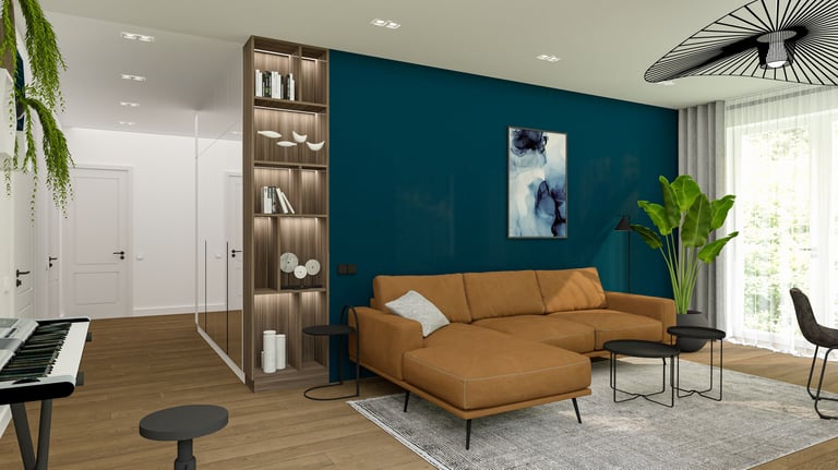 Butas projektuotas nuomai. Atsižvelgiant į šį kriterijų projektuotas žemiškų spalvų interjeras, kuris gali būti lengvai pagyvinamas ryškių akcentų ir interjero detalių pagalba, priklausomai nuo būsimų gyventojų šiuose namuose.